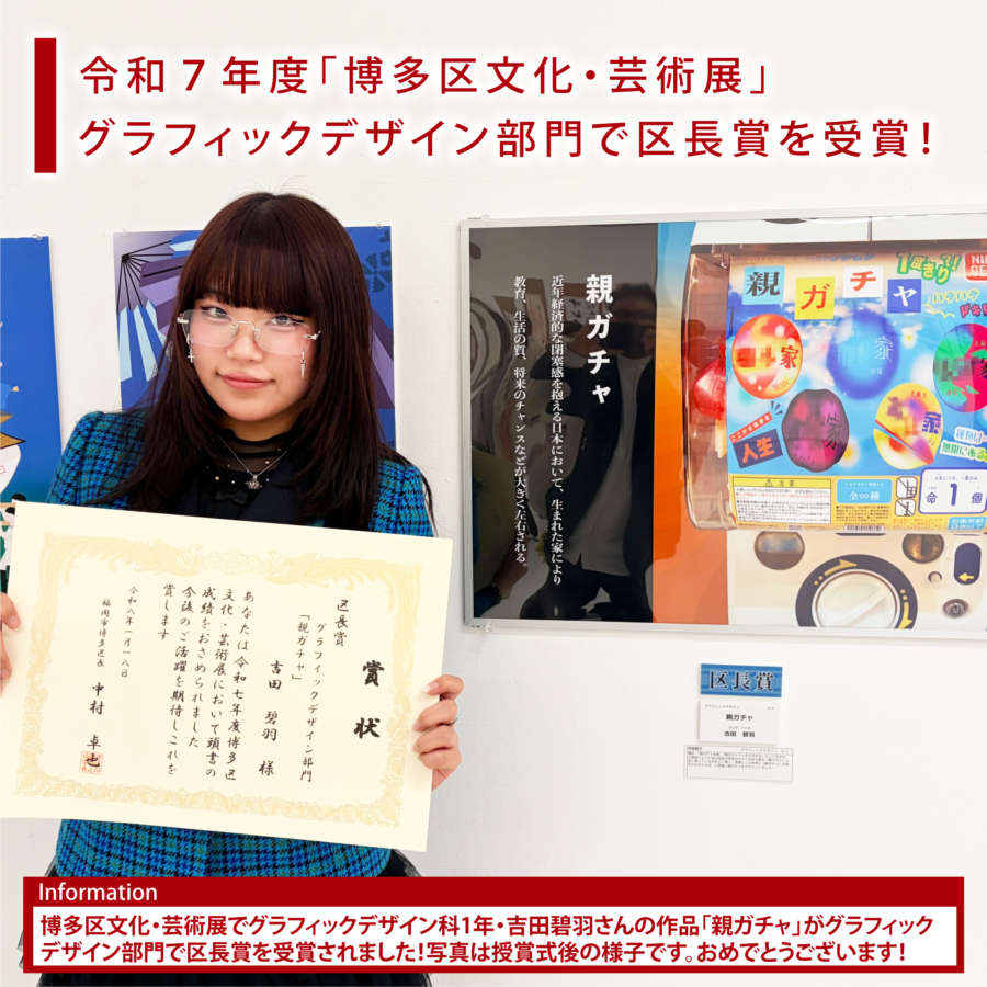 令和7年度「博多区文化・芸術展」グラフィックデザイン部門にて、グラフィックデザイン科1年生の吉田碧羽さんが「区長賞」を受賞しました🎊